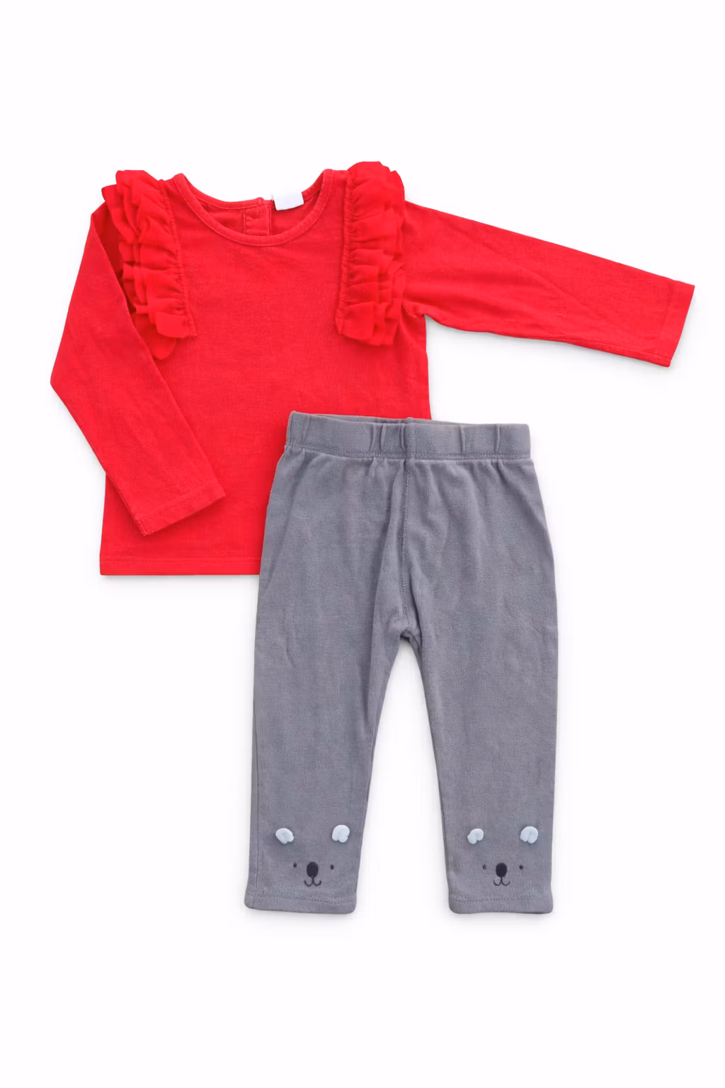 - En röd tröja från H&M och ett par gråa byxor från Carters.