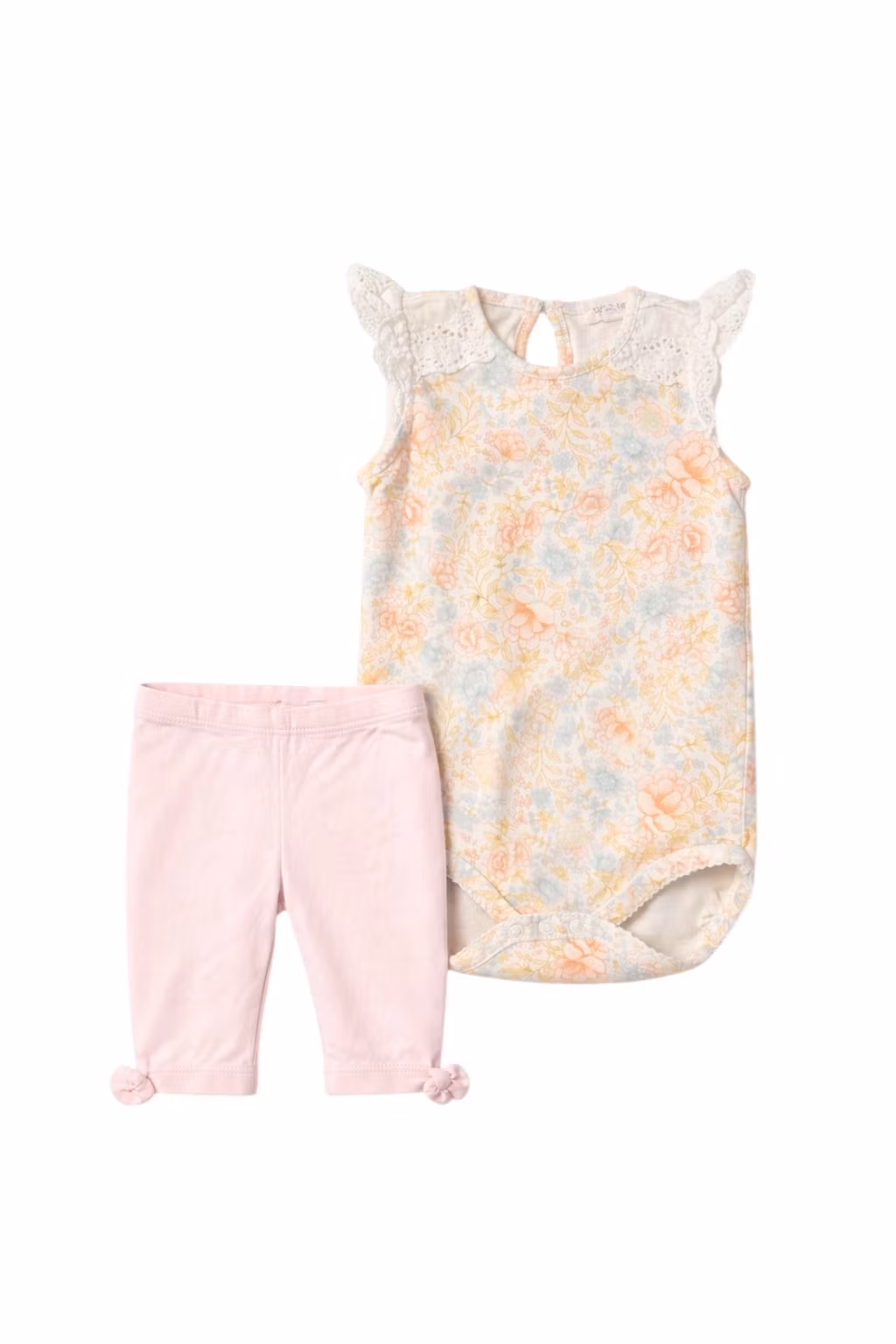 - En blommig body från Newbie och ett par ljusrosa trekvartsbyxor från H&M.