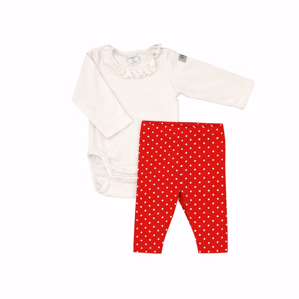 - En vit body från Polarn & pyret och ett par röda byxor från Lindex.