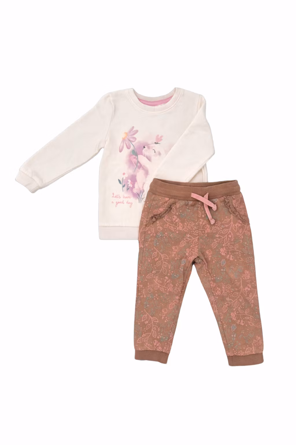 - Ett set med en vit tröja och ett par bruna byxor från So Cute.