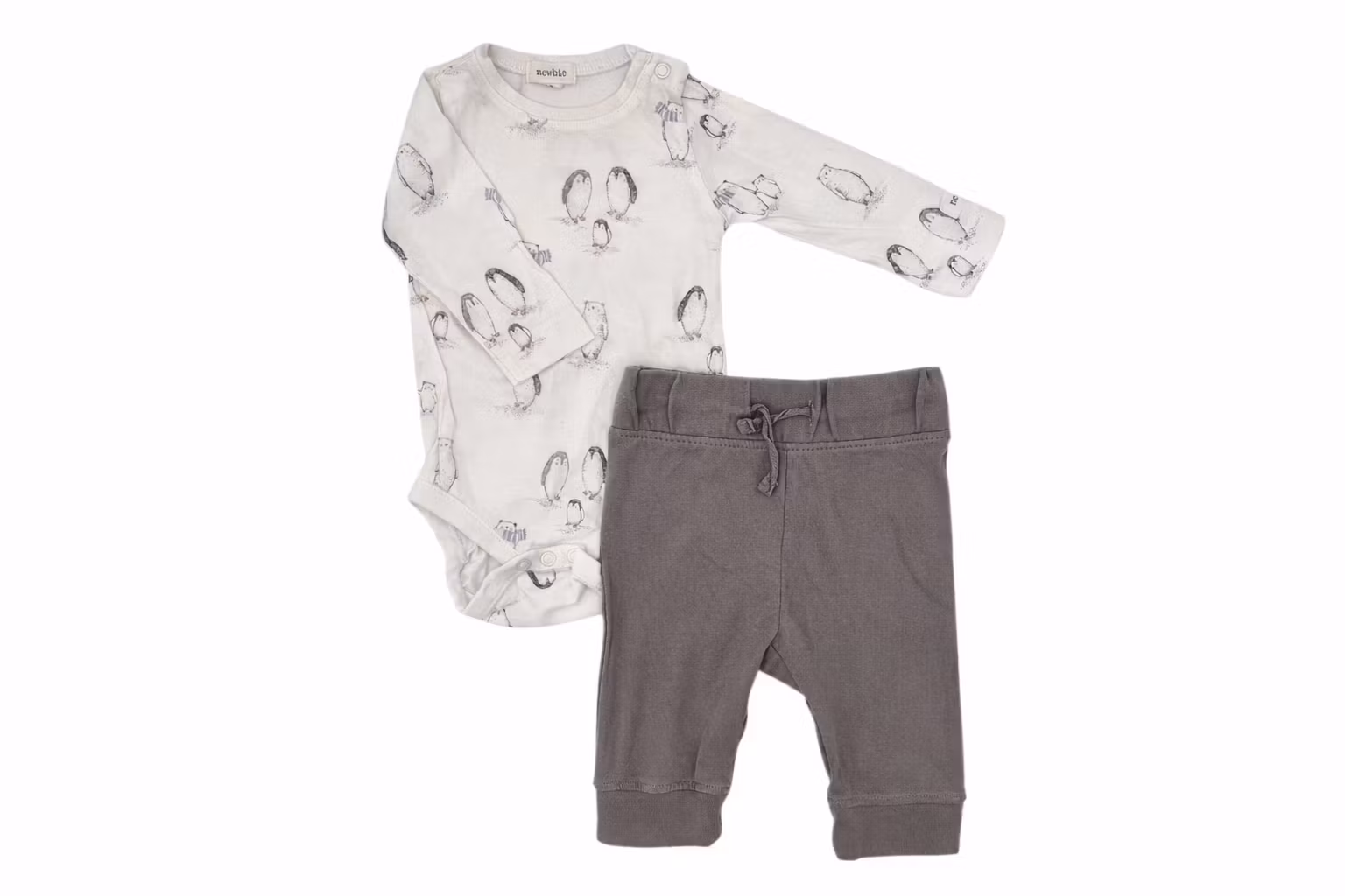 - En vit body med pingviner från Newbie och ett par gråa byxor från Tilly & Maddox.