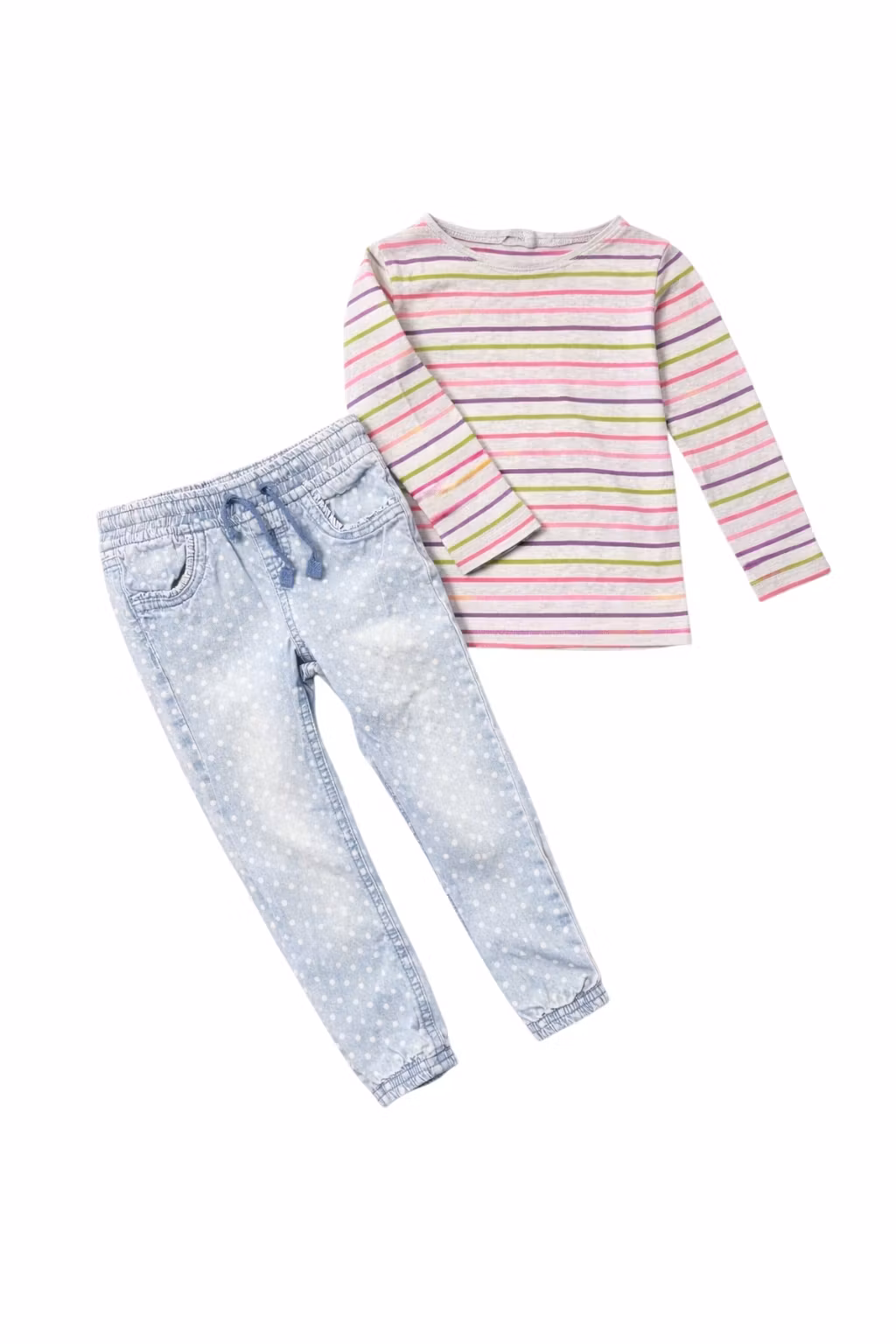 - En grå randig tunn långärmad från Lindex och ett par jeans med vita prickar från Seppälä.