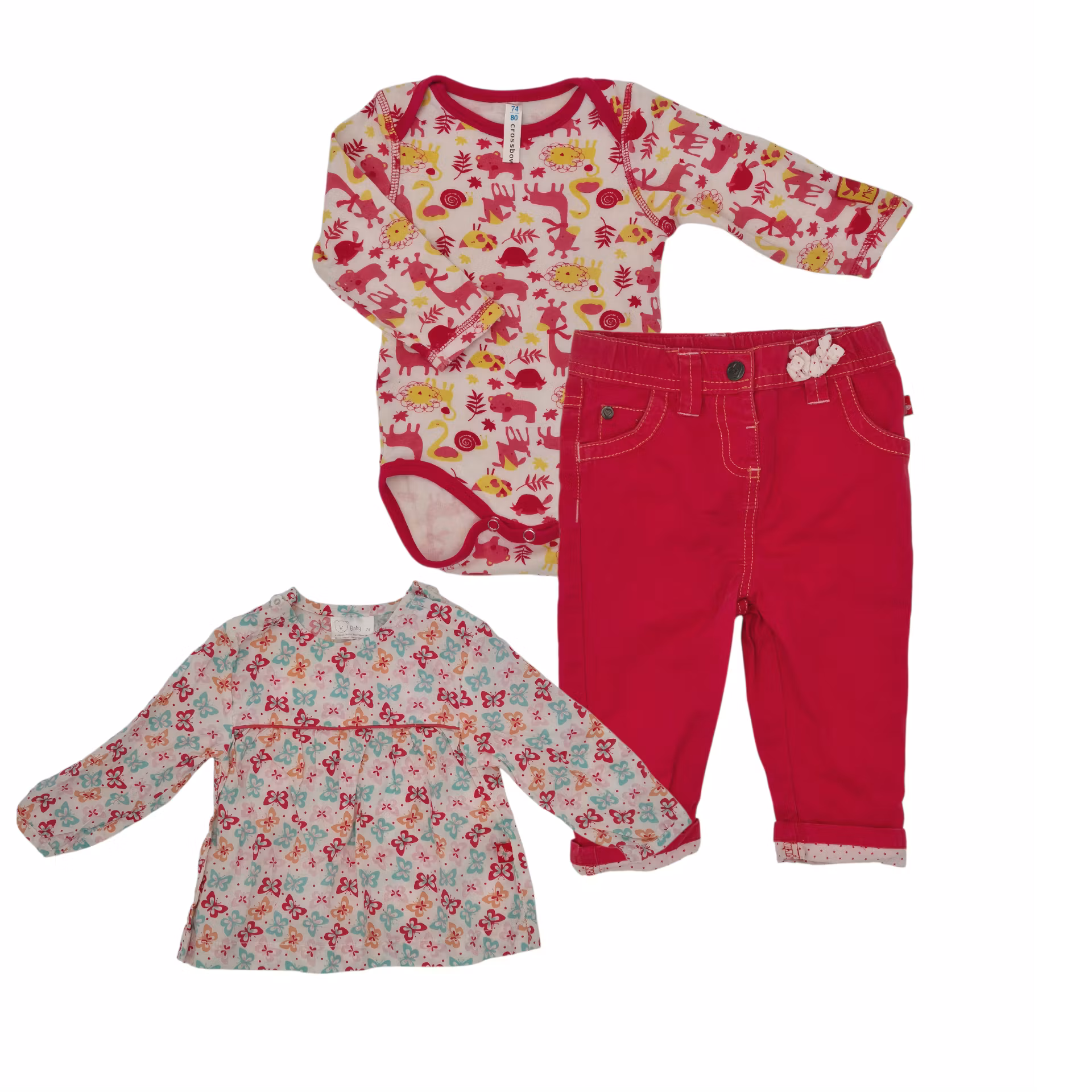 - Ett set med en blus och ett par röda byxor från Baby och en body från Crossbow ( Storlek 74/80 ).