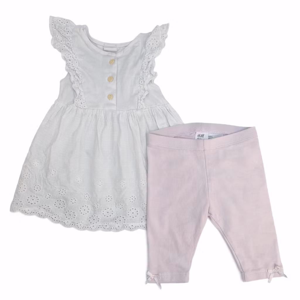 - Ett set med en vit klänning och ett par lila cykelbyxor