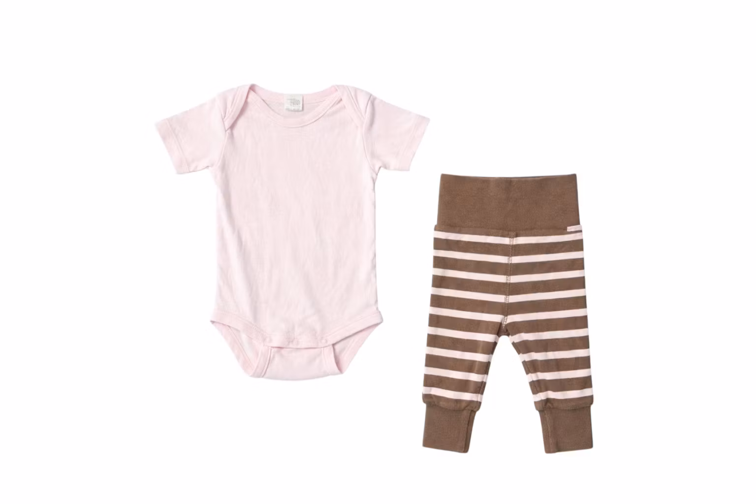 - En ljusrosa body från Lindex och ett par bruna och rosa randiga byxor från H&M.