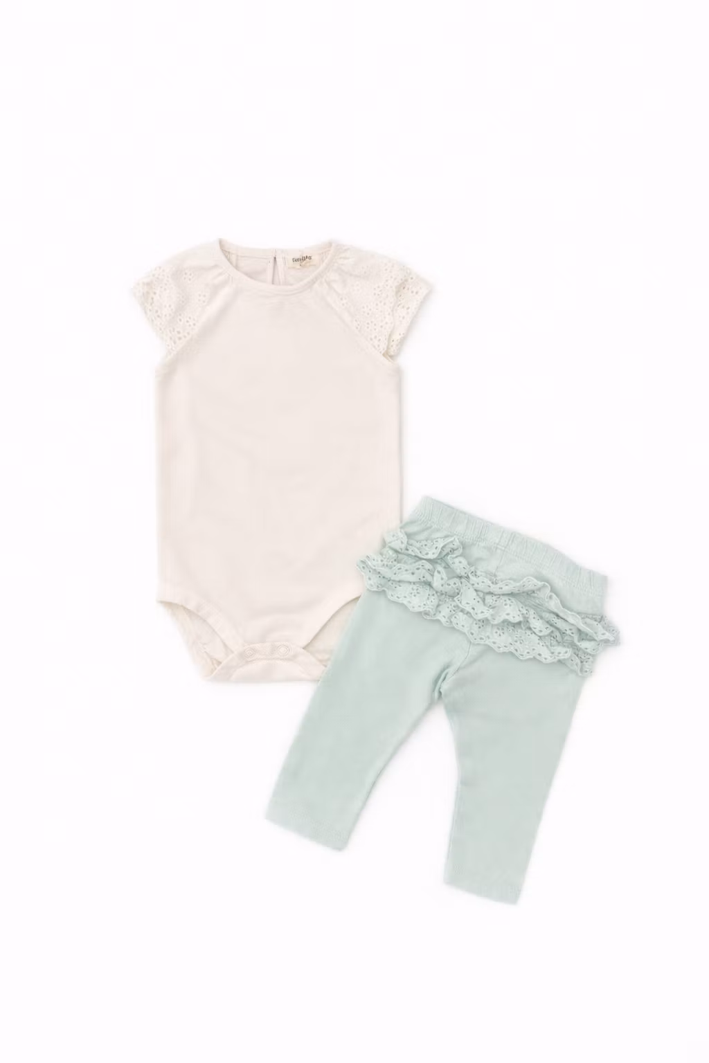 - Ett vit body från Newbie och ett par ljusgröna/turkos byxor från Name it.