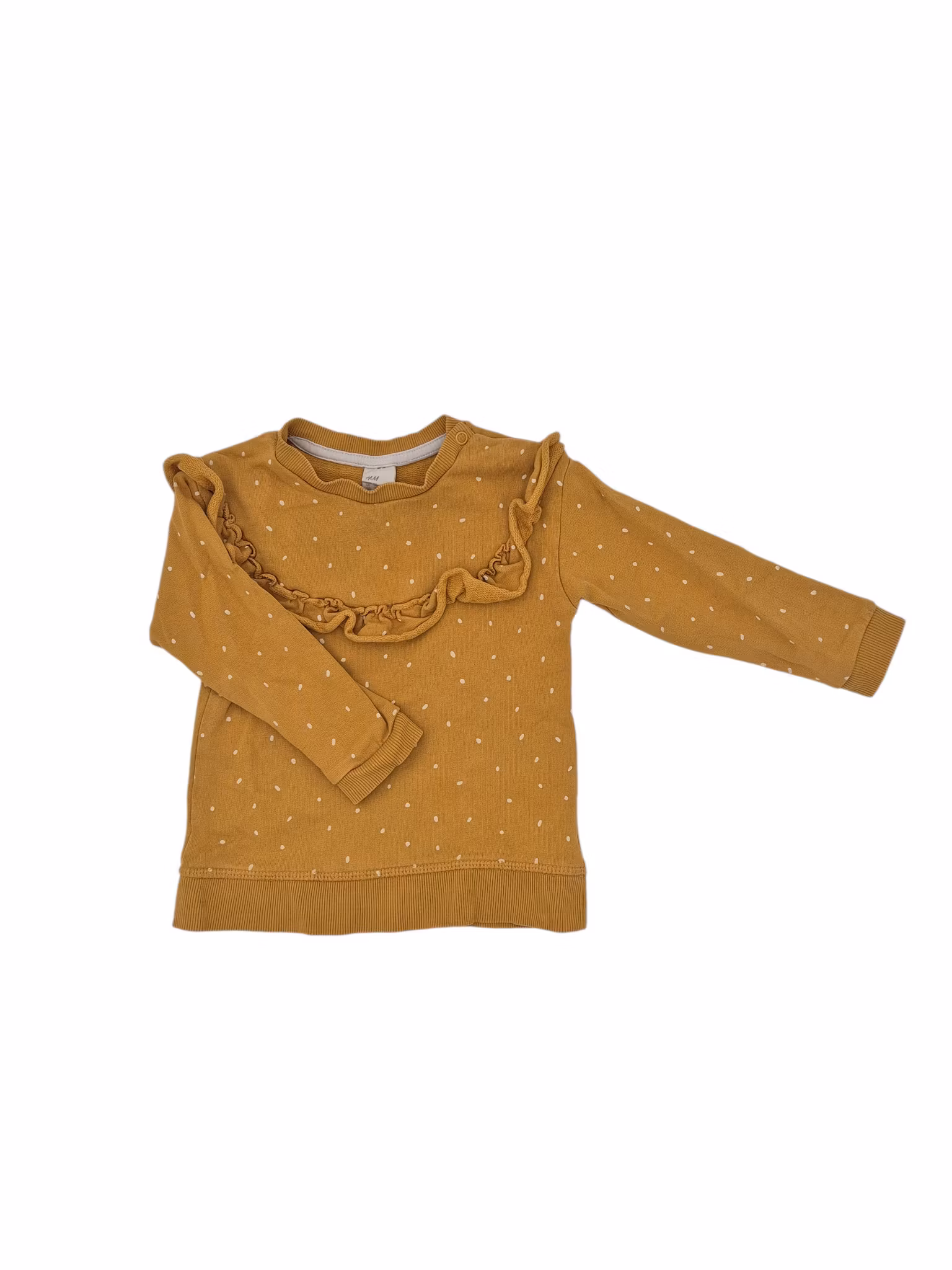Plagget är använt och har normalt bruksslitage, exempelvis lätt blekning från tvätt eller nopprigt. I övrigt är det helt och i gott skick.